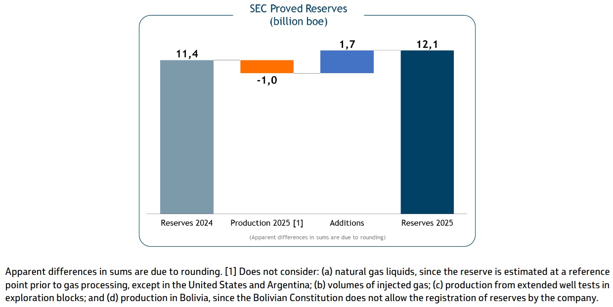 Petrobras also estimates reserves according to the ANP/SPE (National Agency of Petroleum, Natural Gas and Biofuels / Society of Petroleum Engineers) definitions. As of December 31, 2025, the proved reserves according to these definitions reached 12.5 billion barrels of oil equivalent (boe). The differences between reserves estimated by ANP/SPE definitions and those estimated using SEC regulation are mainly due to different economic assumptions and the possibility, under ANP reserves regulations, of recognizing as reserves the volumes expected to be produced beyond the concession term in Brazilian fields.