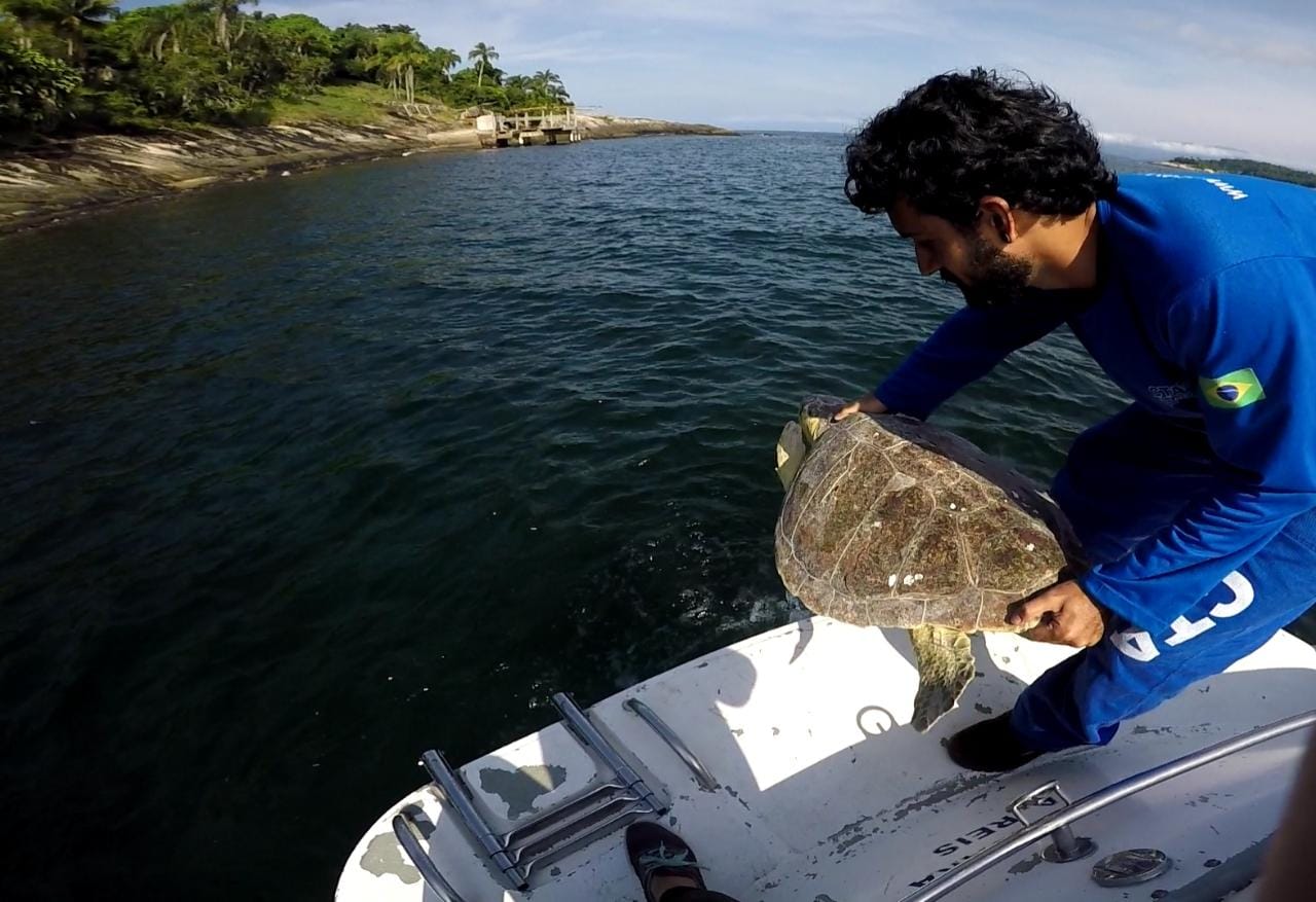 Soltura de tartaruga marinha pelo Projeto de Monitoramento de Praias da Bacia de Santos (PMP-BS), em Angra dos Reis